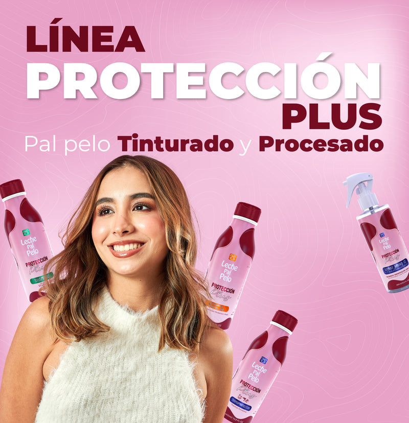 La Línea Protección Plus de Leche Pal Pelo está formulada para aquellas personas que han sometido su cabello a tratamientos químicos como tintes, queratinas, decoloraciones, alisados o rizados permanentes, entre otros. Los productos de esta línea no solo prolongan los efectos de los tratamientos, sino que también nutren y reparan el cabello dañado.