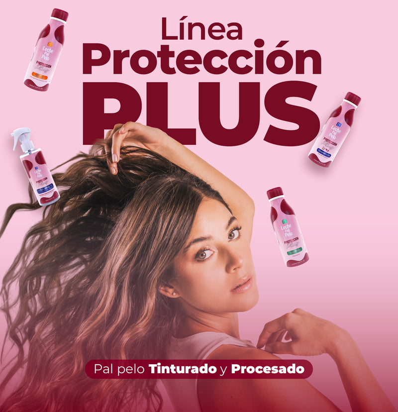 La Línea Protección Plus de Leche Pal Pelo está formulada para aquellas personas que han sometido su cabello a tratamientos químicos como tintes, queratinas, decoloraciones, alisados o rizados permanentes, entre otros. Los productos de esta línea no solo prolongan los efectos de los tratamientos, sino que también nutren y reparan el cabello dañado.